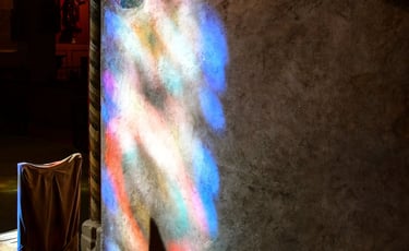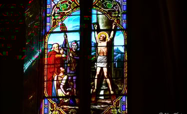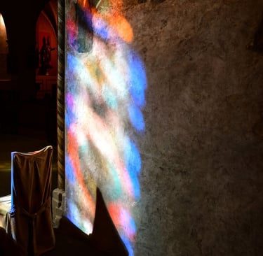À 12h précises, selon l'inclinaison du soleil, la lumière traverse les vitraux pour projeter des taches bleutées au sol ou sur les piliers : les célèbres "Pommes Bleues".