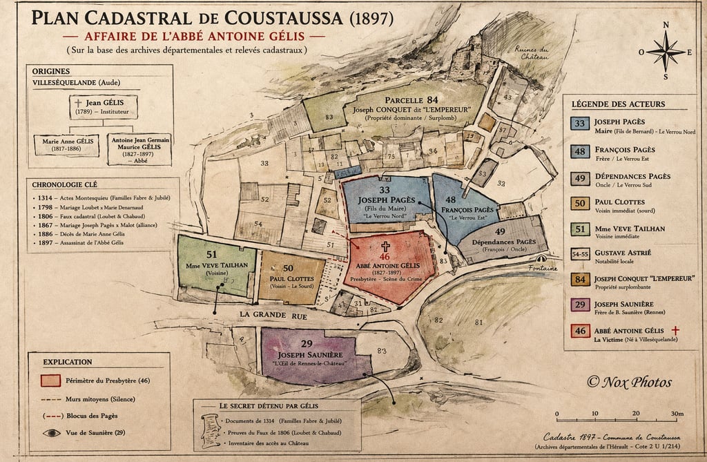 Le Verrou des Pagès : Joseph Pagès (parcelle 33) et François Pagès (parcelles 48 et 49) tiennent les deux flancs du presbytère. Leur père, Jean Pagès, est le Maire de Coustaussa. L'abbé est au centre d'une tenaille politique et foncière.
