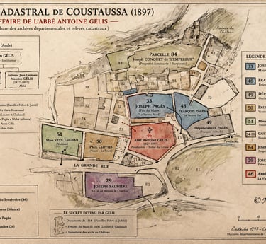 (1) État Civil et Dossiers de Succession : Acte de décès de Marie Gélis (1886) confirmant l'isolement de l'abbé. Dossier de suivi de Joseph Pagès confirmant sa fuite/relocalisation à Espéraza post-procès. (2) Archives Criminelles (Gendarmerie de Limoux) : Procès-verbal de la scène de crime du 1er novembre 1897 (Constat des 800 francs or laissés sur place et des papiers fouillés). (3) Matrice Cadastrale de Coustaussa (1897) : Analyse visuelle du blocus. Emplacements exacts des parcelles 33 (Joseph Pagès), 48/49 (François Pagès), et de la parcelle 29 (Joseph Saunière). (4) Dépositions des Voisins (1897) : Interrogatoires des familles Clottes (parcelle 50) et Tailhan (parcelle 51) attestant du "silence" général malgré la mitoyenneté. (5) Registres Paroissiaux (1798) : Acte de mariage de Bernard Loubet et Marie Denarnaud (Branche de Coustaussa) en date du 26 juillet. (6) Archives du Ministère de la Justice (1806) : Dossier exportPDFUD-1.pdf actant les accusations de malversations et de faux en écriture sur les parcelles A 557 à 568 par le Maire B. Loubet. (7) Fonds Montesquieu-Roquefort (Série 7J) : Textes médiévaux de 1314 attestant de la propriété légitime des terres par les familles Fabre et Jubilé, contredisant le cadastre du XIXe siècle...