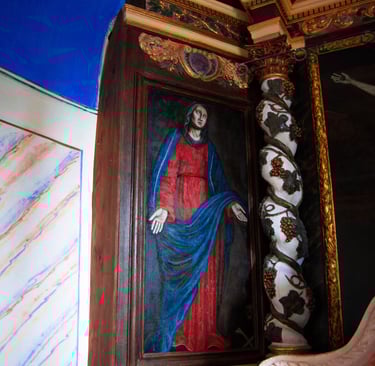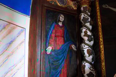 Cette mise en scène est exceptionnelle : là où la tradition impose généralement l'isolement du Christ par respect, cette œuvre brise les codes pour lier directement le clergé au sacrifice divin. C'est un témoignage rare d'art sacré local qui surprend souvent les visiteurs par cette présence humaine inhabituelle au pied de la Croix.